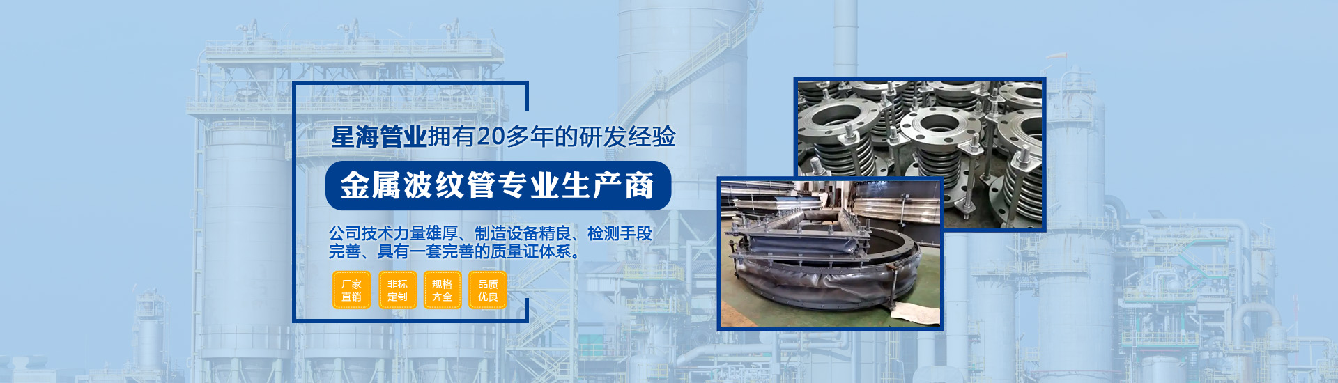 泰州市星海管業(yè)有限公司座落于風(fēng)景如畫的江蘇魚米之鄉(xiāng),是一家專業(yè)生產(chǎn)金屬波紋管的高新企業(yè)。本公司技術(shù)力量雄厚、制造設(shè)備精良、檢測(cè)手段完善、具有一套完善的質(zhì)量證體系,系列產(chǎn)品齊全、質(zhì)量可靠、價(jià)格合理,深受廣大用戶的信賴和好評(píng)。主導(dǎo)產(chǎn)品是金屬波紋膨脹節(jié),不銹鋼金屬軟管,滑動(dòng)式伸縮節(jié),填料函式伸縮節(jié),橡膠補(bǔ)償接頭,各種型號(hào)彈性吊架...